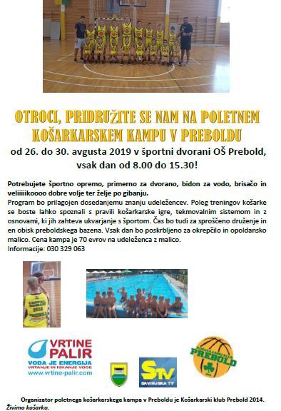 V tednu od 26. do 30. avgusta KK Prebold 2014 organizira poletni počitniški kamp za vse člane kluba ter druge otroke, ki jih zanima košarka. Lahko se že vpišejo tudi v šolo košarke.